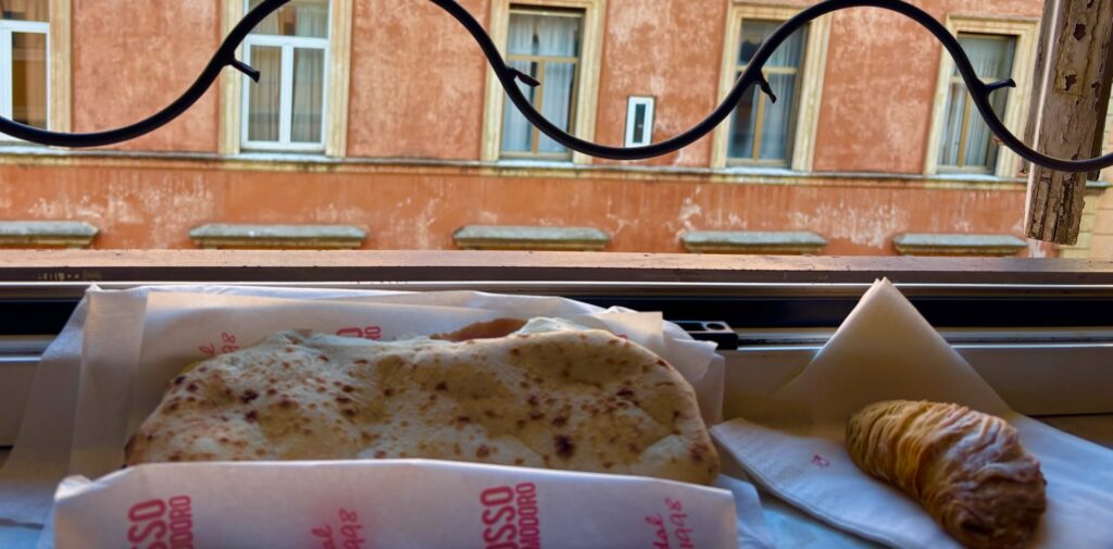 生ハムとチーズが挟まっているパンとイタリア名物スフォリアテッラを食べました。