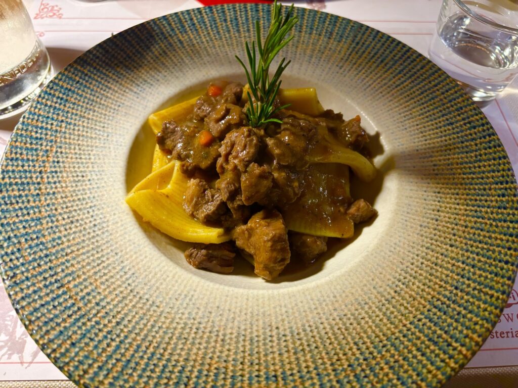 ラグーのパッパルデッレとポルチーニ茸のスライスビーフを注文。
