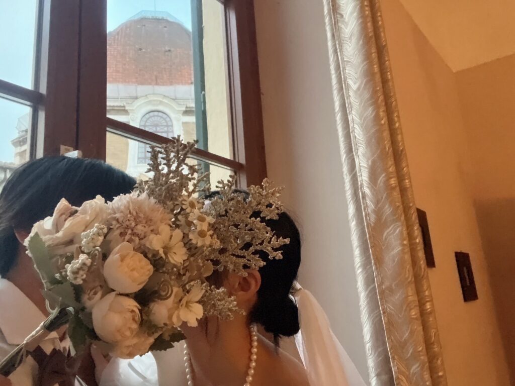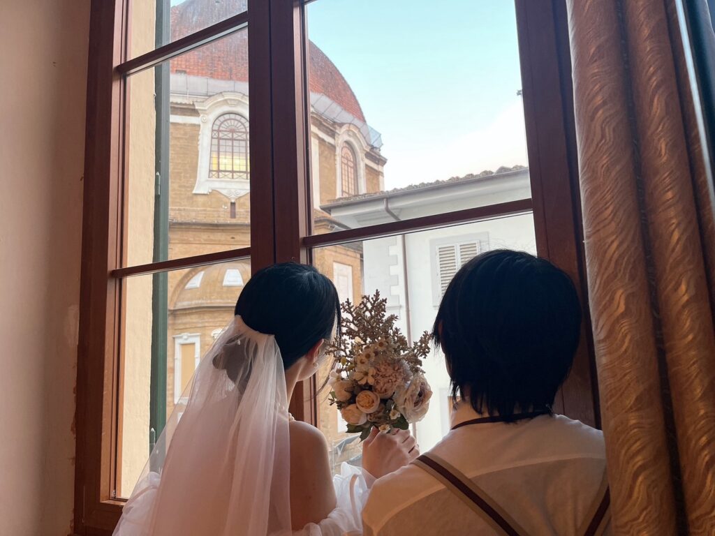 窓からの景色が綺麗だったので持ってきたドレスを着て、ウエディングフォトを自分たちで撮りました。