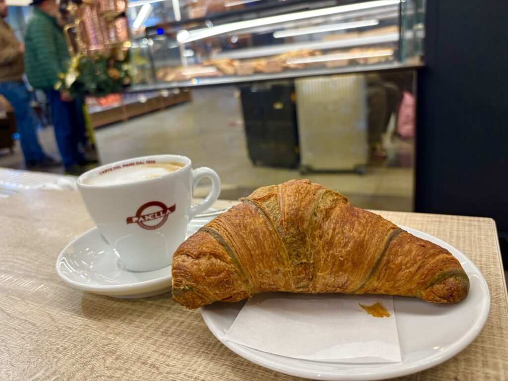 出発まで時間があったので、駅の中のカフェでカプチーノとずっと食べたかったピスタチオクロワッサンを注文。