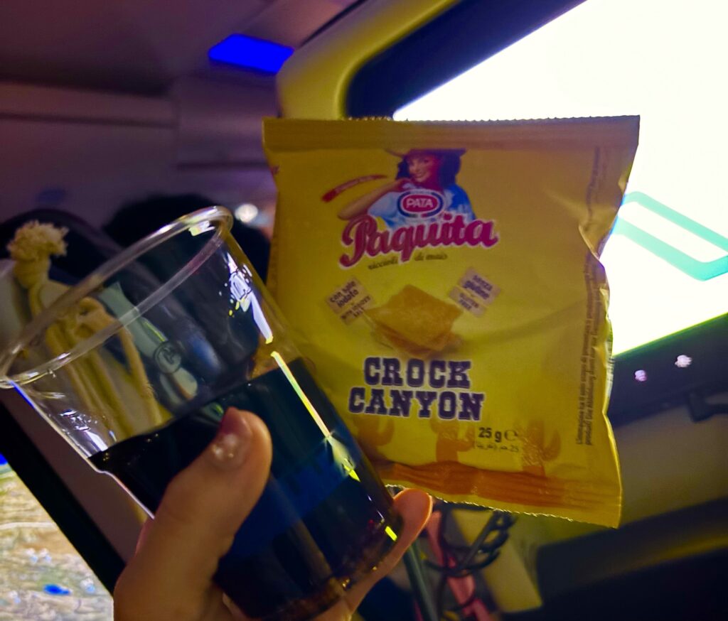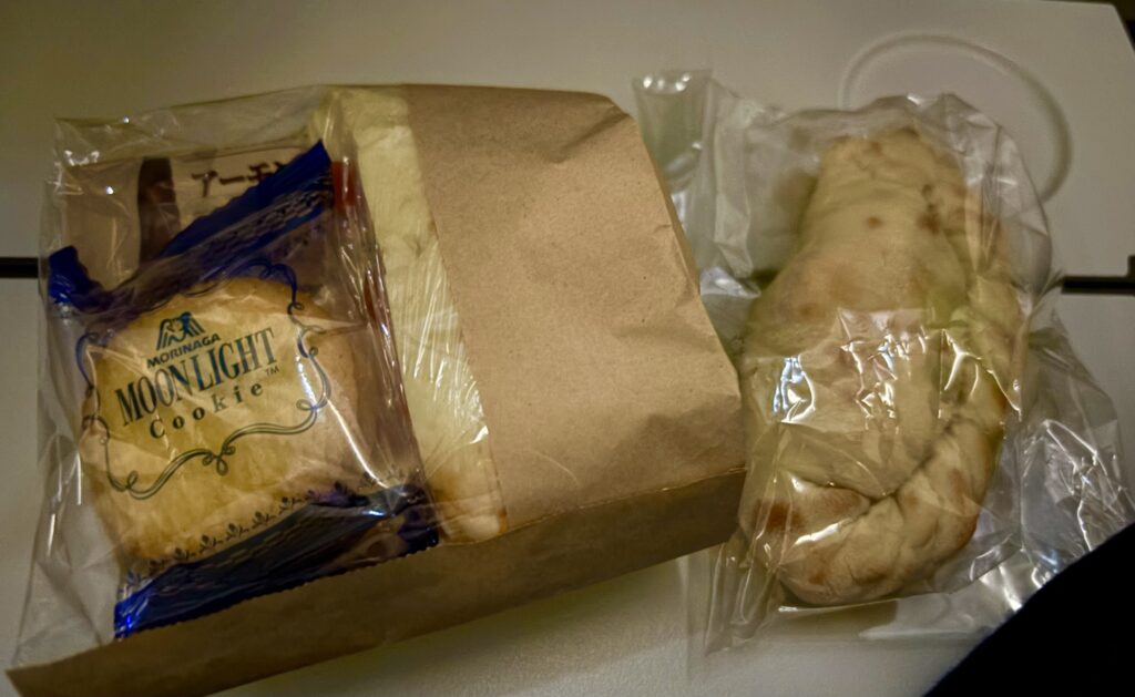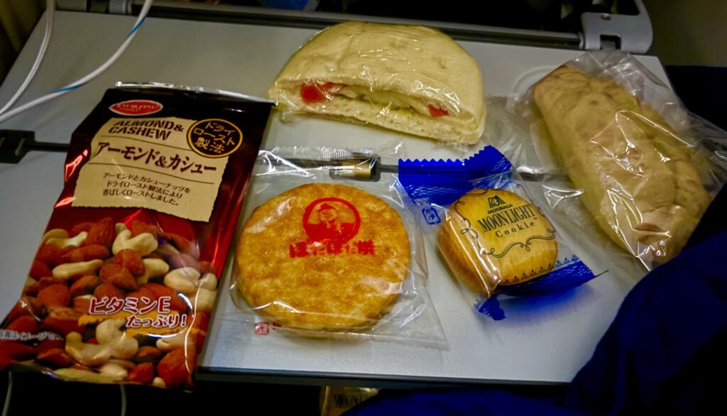・機内食の後、後ろにお菓子と飲み物が置いてあるため取りに行きやすいこと